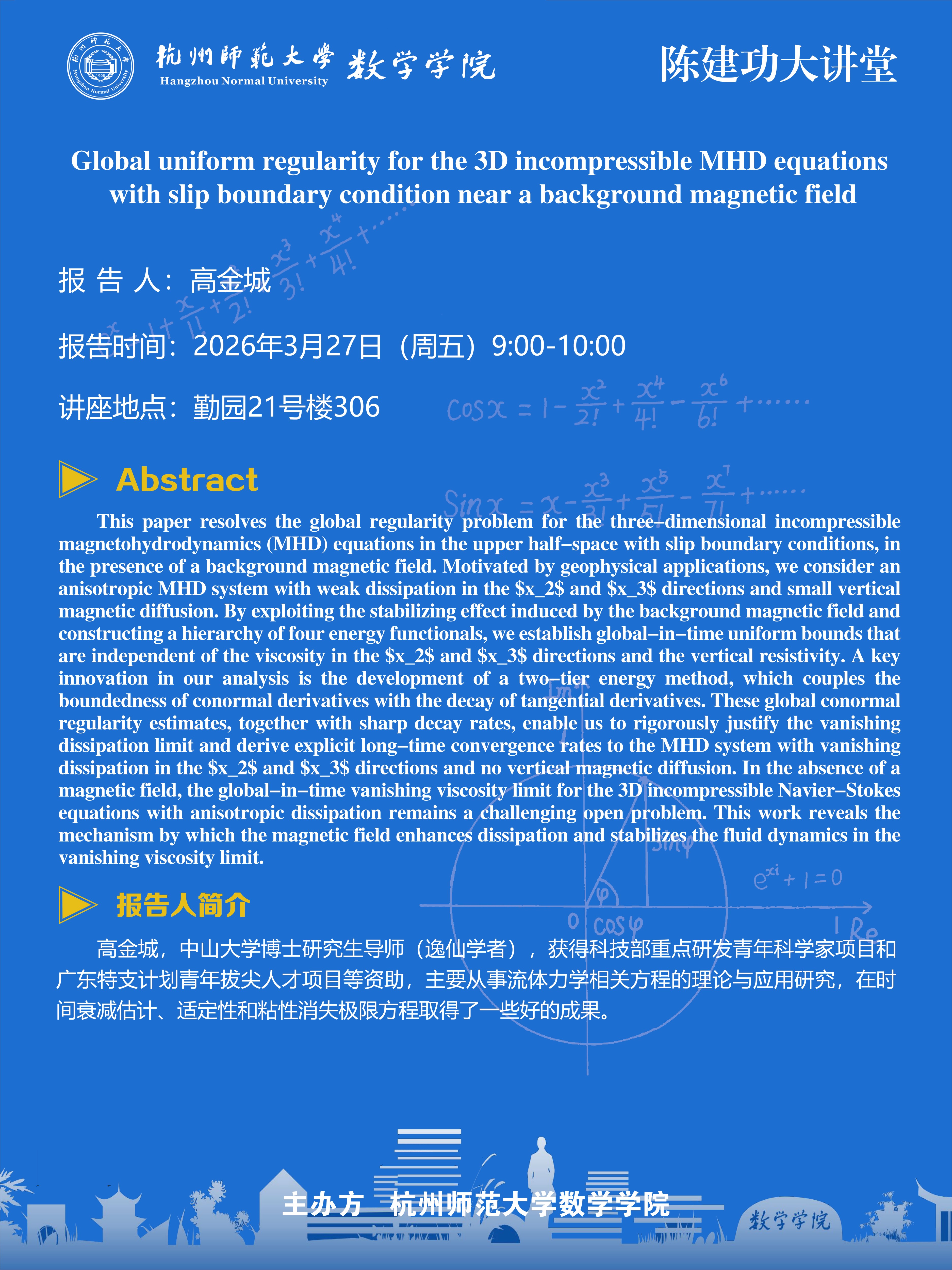 陈建功大讲堂(2026-9):Global uniform regularity for the 3D incompressible MHD equations with slip boundary condition near a background magnetic field
