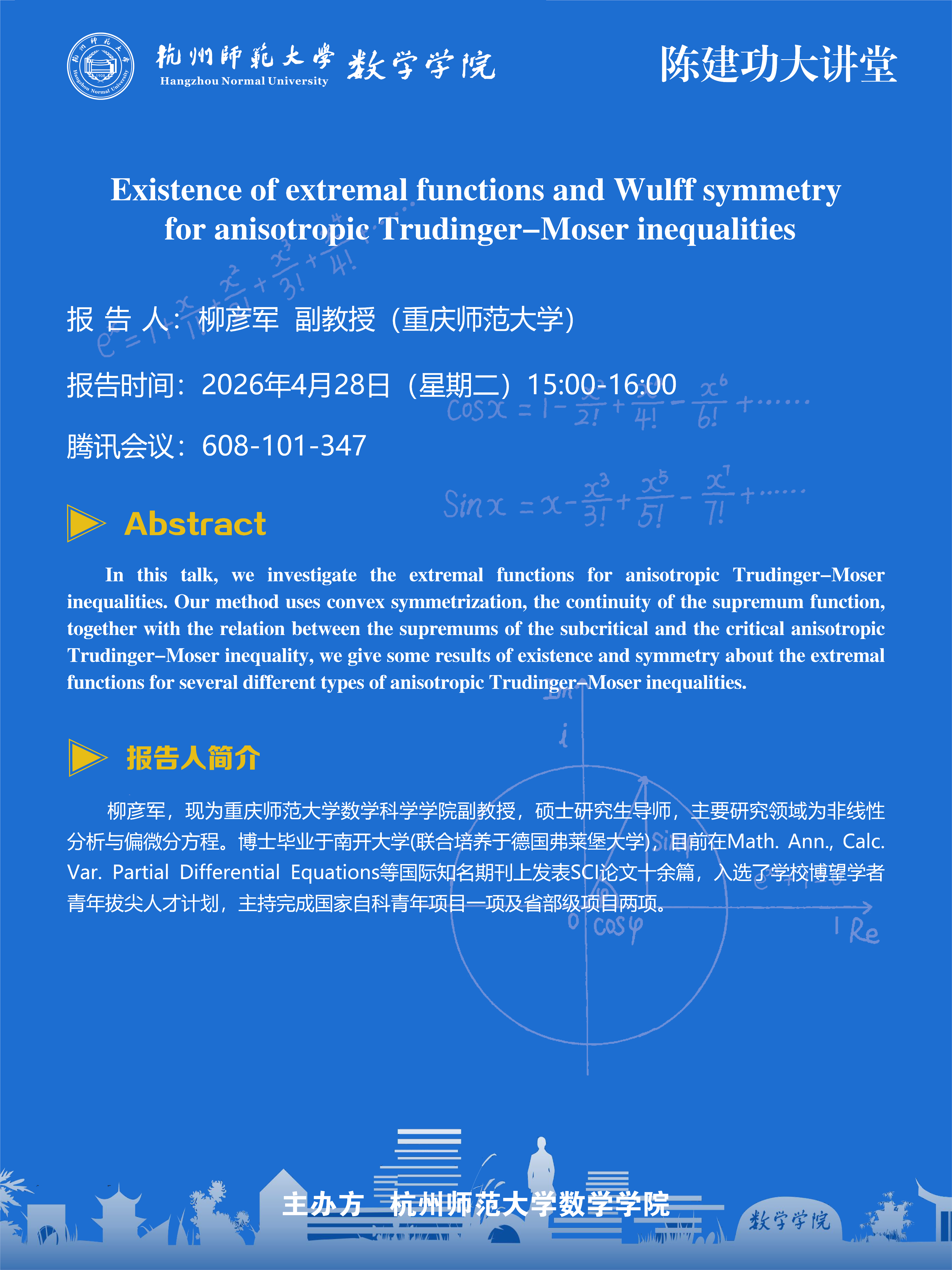 陈建功大讲堂(2026-21):Existence of extremal functions and Wulff symmetry for anisotropic Trudinger-Moser inequalities